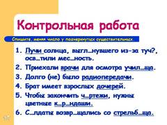 17 Лучи солнца, выгл…нувшего из-за туч?, осв…тили мес…ность. Приехали врачи для осмотра учил…ща. Долго (не) было радиопередачи. Брат имеет взрослых дочерей. Чтобы закончить ч…ртежи, нужны цветные к…р…ндаши. С…лдаты возвр…щались со стрельб…ща. Спишите, меняя число у подчеркнутых существительных.
