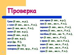 8 Грош(2 скл., м.р.), с плеч(2 скл., мн.ч., Р.п.), свеч (1 скл, мн.ч., Р.п.), калач (2 скл. м.р.), хвощ (2 скл., м.р.), луч (2 скл. м.р.), жгуч (кр. П.), неуклюж (кр. П.), пожарищ (2 скл, ср.р., Р.п.), для афиш (1 скл., ж.р.), луж (1 скл., мн.ч., Р.п.), передач (1 скл., мн.ч., Р.п.), зрелищ (1 скл., мн.ч., Р.п.), пастбищ (2 скл., мн. Ч., Р.п.), туч (1 скл., мн.ч., Р.п.), с крыш (1 скл., мн.ч. Р.л.), задач (1 скл., мн.ч., Р.п.), у дач (1 скл., мн.ч., Р.п.), груш (1 скл., мн.ч., Р.п.).