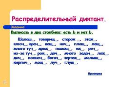 Выборочный диктант. Из текста выбрать слова с орфограммой и разнести их в две колонки: в одну с Ь, а в другую - без Ь.