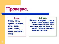6 3 скл. Вещь, ночь, дрожь, помощь, речь, рожь, дочь, ложь, дичь, полночь, мощь. 1,2 скл. Шалаш, товарищ, сторож, этаж,лещ, ключ, врач, плащ,лещ, много туч, из-за туч, богач, много задач, чертеж, малыш, кирпич, луч, еж.