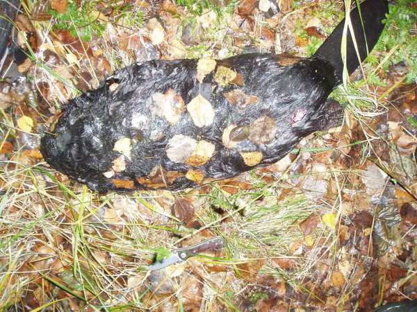 В момент выстрела, он сидел и смотрел на меня. Или из-за вызванного необходимостью поспешного выстрела или из-за того, что стрелял сверху вниз, немного занизил и попал ему в брюхо полуоболочкой калибра 30-06… короче, потрошить его было не нужно, все осталось на берегу и в канаве.