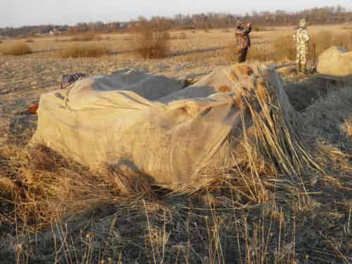 Устраивать укрытия для охоты на гуся весной рядом с копной соломы или сена, а также в ней, у куста, линий электропередач не следует. Гуси будут присаживаться от них подальше и окажутся вне выстрела.