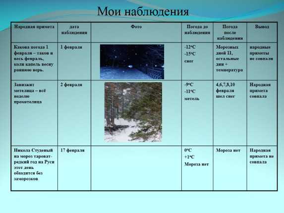 Еще можно сделать вывод, что изменение экологии не повлияло на правильность примет. Климат по-прежнему предсказуем. Наши предки не зря веками наблюдали за погодой, и нам не стоит забывать об их опыте.