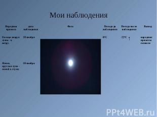 Я решил отобрать несколько примет и в течение ноября 2008 года провести наблюдения за погодой, чтобы отмечать верность примет или наоборот. Вот некоторые из них: Я решил отобрать несколько примет и в течение ноября 2008 года провести наблюдения за погодой, чтобы отмечать верность примет или наоборот. Вот некоторые из них: Кольцо вокруг луны - к ветру; Ясная, круглая луна - зимой к стуже; Кошка лежит животом или носиком к верху - к теплу; Кошка скребет пол - к ветру и метели.