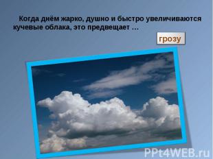 Роль примет в прогнозах погоды велика, с их помощью можно дать достаточно точный прогноз погоды на ближайший день. Меня очень заинтересовала эта тема, так как моя бабушка всегда умела предсказывать погоду, глядя, например, на облака за окном. Это меня так увлекло, что я решил рассказать вам об этом увлечении приметами. Роль примет в прогнозах погоды велика, с их помощью можно дать достаточно точный прогноз погоды на ближайший день. Меня очень заинтересовала эта тема, так как моя бабушка всегда умела предсказывать погоду, глядя, например, на облака за окном. Это меня так увлекло, что я решил рассказать вам об этом увлечении приметами. Я заметил, что наиболее достоверными являются те приметы которые основаны на местных признаках погоды. Еще необходимо помнить, что использование для прогноза только одной какой-либо приметы является мало надёжным предсказанием.