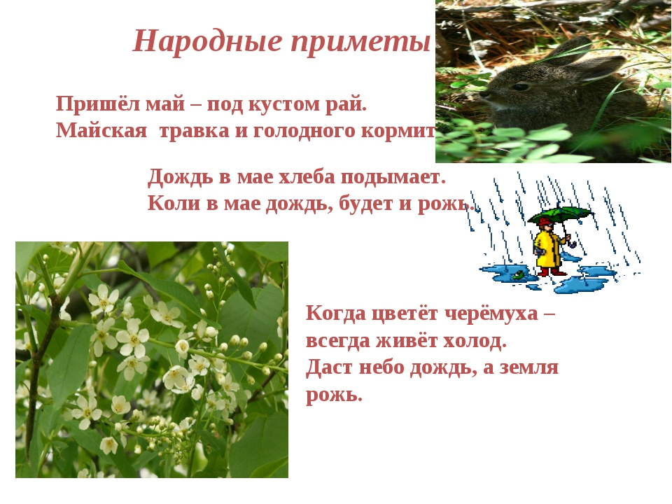 Народные приметы в мае: «Май холодный – год хлебородный», «Апрель с водой, май с травой», «Март сухой да мокрый май – будет каша и каравай». Свой прогноз май частично берет от февраля. От погоды в мае у русского крестьянина зависела судьба урожая и все его благополучие. Здесь – и правильные сроки сева, и угадать, чтобы отсеяться до дождя. Русский крестьянин на сев имел свои приметы.