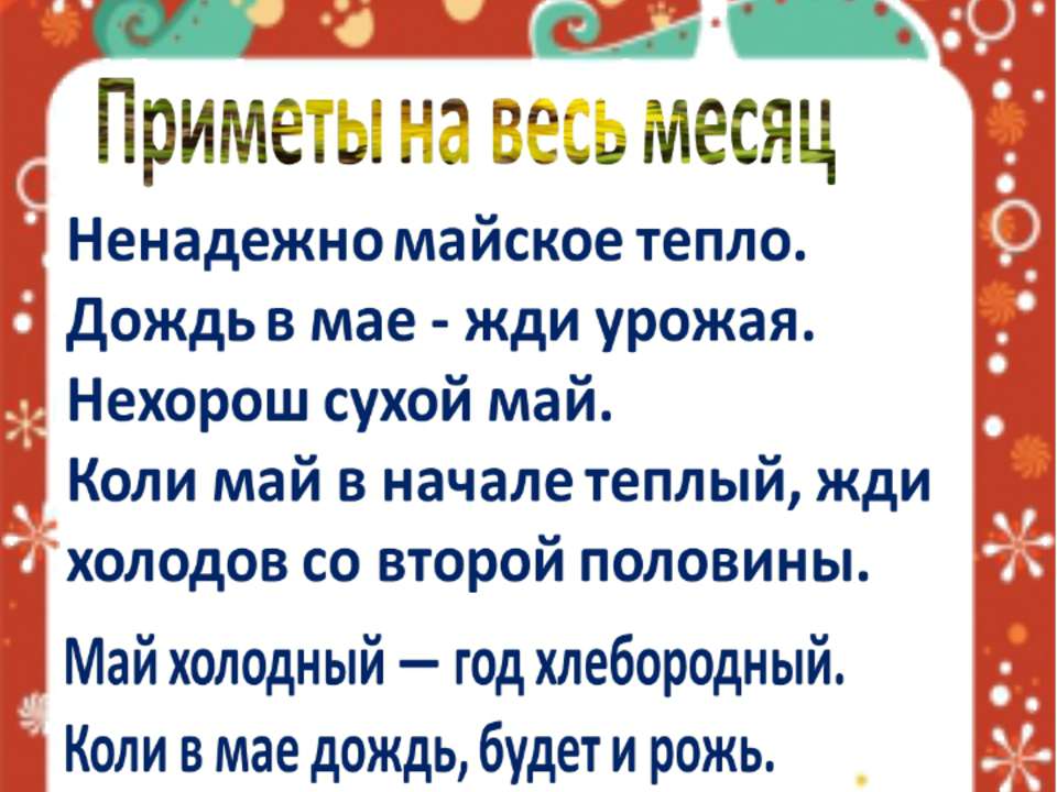 В этом месяце оживает природа: на деревьях раскрываются почки, просыпаются насекомые, прилетают птицы. Для большинства этот месяц напрямую связан с посевами и огородничеством, как было и у наших предков. Поэтому многие приметы мая относятся к урожаю, а также погоде.