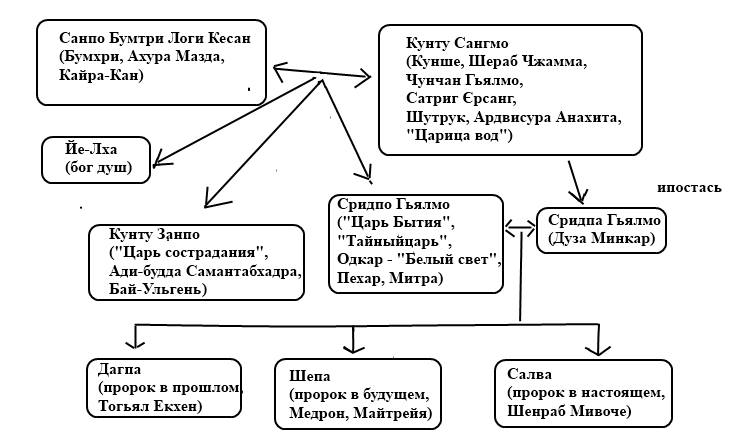 Как говорит Б.И. Кузнецов, сами бонские божества обнаруживают тождественность богам иранского пантеона[i]. Например, «Мудрый Бумкхри» (Sangs-po `Bum-khri) Шенлха Окар (Одкар) – божество высочайшего сострадания, представляет аспект ясности и совершенства пробужденного ума. Он изображается в медитатив.