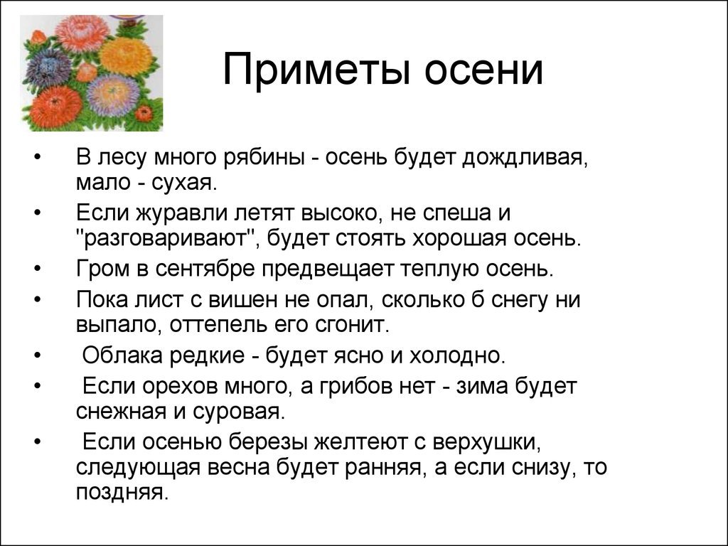 Из них тоже можно определить некоторые приметы осени для дошкольников. Вот некоторые из них: