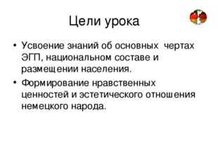 Цели урока Усвоение знаний об основных чертах ЭГП, национальном составе и размещении населения. Формирование нравственных ценностей и эстетического отношения немецкого народа.