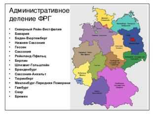 Административное деление ФРГ Северный Рейн-Вестфалия Бавария Баден-Вюртемберг Нижняя Саксония Гессен Саксония Рейнланд-Пфальц Берлин Шлезвиг-Гольштейн Бранденбург Саксония-Анхальт Тюринберг Мекленбург-Передняя Померания Гамбург Саар Бремен