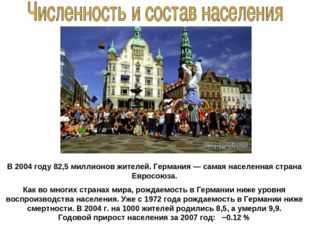 В 2004 году 82,5 миллионов жителей. Германия — самая населенная страна Евросоюза. Как во многих странах мира, рождаемость в Германии ниже уровня воспроизводства населения. Уже с 1972 года рождаемость в Германии ниже смертности. В 2004 г. на 1000 жителей родились 8,5, а умерли 9,9. Годовой прирост населения за 2007 год: −0.12 %