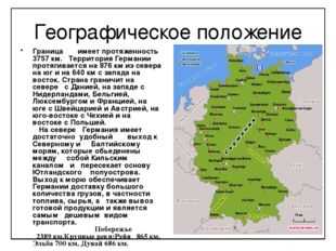 Географическое положение Граница имеет протяженность 3757 км. Территория Германии протягивается на 876 км из севера на юг и на 640 км с запада на восток. Страна граничит на севере с Данией, на западе с Нидерландами, Бельгией, Люксембургом и Францией, на юге с Швейцарией и Австрией, на юго-востоке с Чехией и на востоке с Польшей. На севере Германия имеет достаточно удобный выход к Северному и Балтийскому морям, которые обьеденены между собой Кильским каналом и пересекает основу Ютландского полуострова. Выход к морю обеспечивает Германии доставку большого количества грузов, в частности топлива, сырья, а также вывоз готовой продукции и является самым дешевым видом транспорта. Побережье 2389 км.Крупные реки:Рейн 865 км, Эльба 700 км, Дунай 686 км.