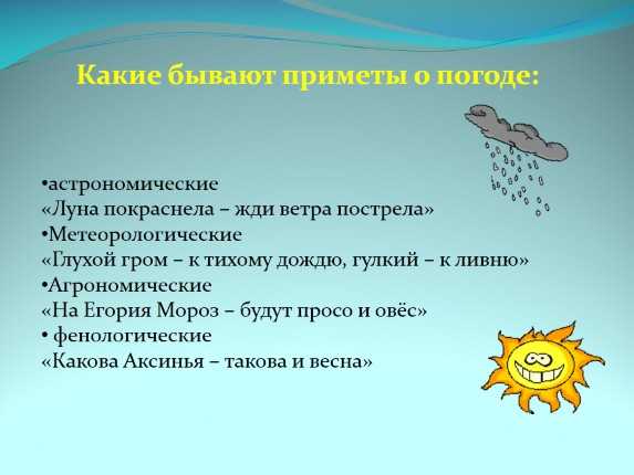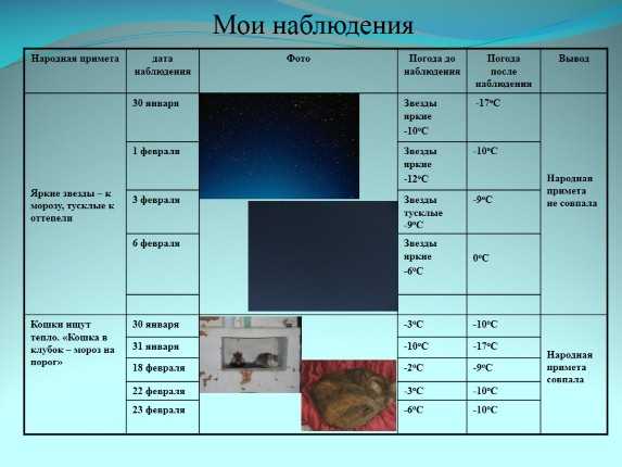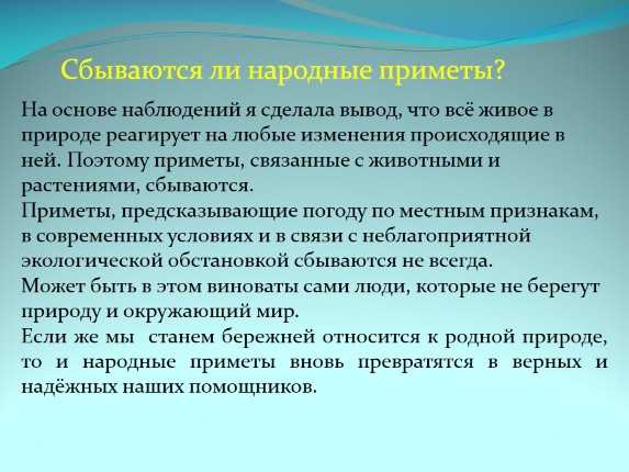 Еще можно сделать вывод, что изменение экологии не повлияло на правильность примет. Климат по-прежнему предсказуем. Наши предки не зря веками наблюдали за погодой, и нам не стоит забывать об их опыте.