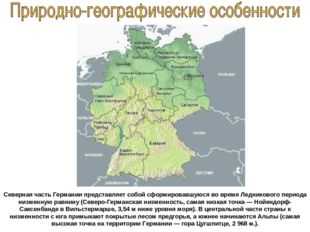 Северная часть Германии представляет собой сформировавшуюся во время Ледникового периода низменную равнину (Северо-Германская низменность, самая низкая точка — Нойендорф-Саксенбанде в Вильстермарше, 3,54 м ниже уровня моря). В центральной части страны к низменности с юга примыкают покрытые лесом предгорья, а южнее начинаются Альпы (самая высокая точка на территории Германии — гора Цугшпитце, 2 968 м.).