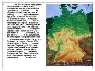 На юге страны находятся отроги Известковых Альп, Баварские Альпы с вершиной Цугшпитце (2963 м) и Берхтенсгаденские Альпы. К северу простираются средневысотные Рейнские Сланцевые горы, массивы Тюрингенский Лес, Гарц с легендарной горой Броккен (высота 1142 м), Тевтобургский Лес, Рудные горы. На севере расположена Северно-Германская низменность с холмами и озерами, в основном в Гольштейне, Мекленбурге. Озера имеются и в предгорьях Альп. На юге — Боденское озеро. Около 30% территории страны занято лесами: береза, дуб, бук, ель, сосна. Животный мир: олени, кабаны, зайцы, волки, лисы. Национальные парки — Баварский Лес, Берхтесгаден; многочисленные резерваты, памятники природы.