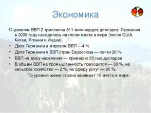 Экономика С уровнем ВВП 2 триллиона 811 миллиардов долларов Германия в 2009 году находилась на пятом месте в мире (после США, Китая, Японии и Индии). Доля Германии в мировом ВВП —4 % Доля Германии в ВВП стран Евросоюза — почти 30 % ВВП на душу населения — примерно 35 тыс.долларов В общем ВВП на промышленность приходится — 38 %, на сельское хозяйство — 2 %, на сферу услуг — 60 %. По уровню жизни страна занимает 10 место в мире.