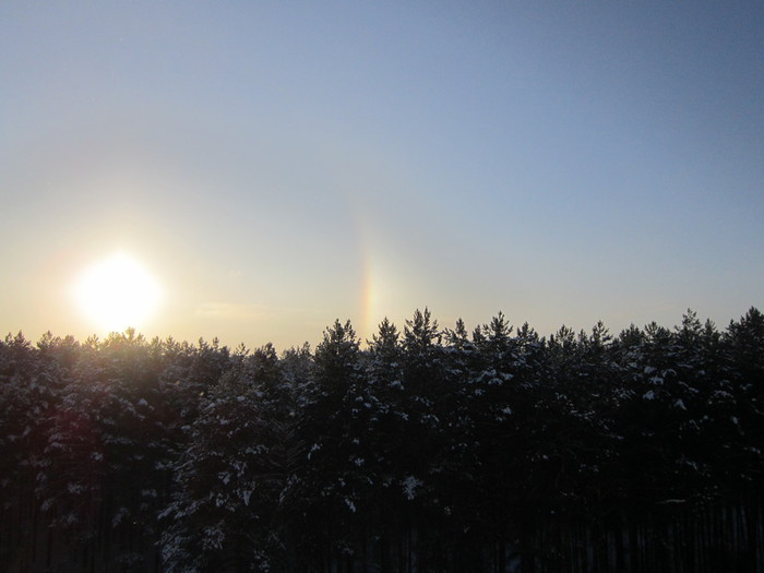 Возникает зимняя радуга при сочетании трех компонентов: солнца, мороза и высокой влажности воздуха. Совпадают эти условия крайне редко и обязательно при смене погоды. Сегодня у нас в Перми -25°.