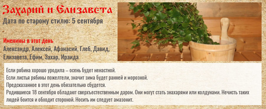 5 сентября. В этот день с утра следят за погодой: отсутствие заморозков говорит о том, что сентябрь будет теплым. По примете, в день народного праздника Лупы Брусничного нужно собрать лен, а то его морозом накроет и хозяева слезы по урожаю потерянному прольют. Ранний отлет журавлей в этот день предвещал холодную осень и суровую зиму.