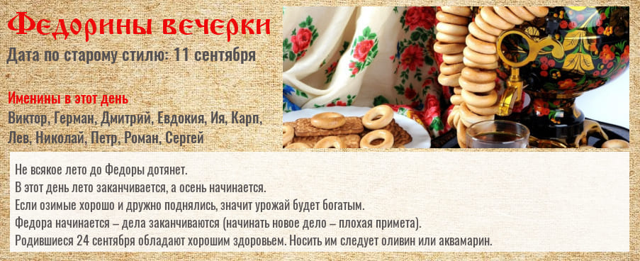 Время подводить итоги летнего сезона и подготовка к зиме. С Федоры начинались капустники. Это слово живо и по сей день, почти в том же смысле. Но только раньше, подобные «вечеринки», действительно, были связаны с капустой. Бабы собирались вместе, заготавливая этот овощ. Рассказывали друг другу различные истории, пели песни, а вечером усаживались за стол.