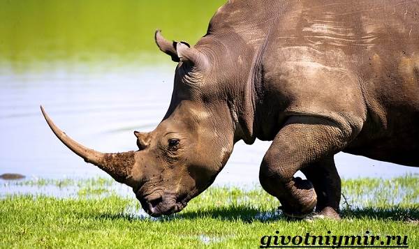 Индийские носороги любят проводить время в воде, в то время как остальные редко посещают водоёмы с этой целью. Зрение у гигантов очень слабое, выручает лишь прекрасно развитое обоняние и стопроцентный слух. Впрочем, немногие хищники рискуют атаковать тушу такого размера – в основном носороги становятся жертвой человека с огнестрельным оружием. Главный отличительный признак, устрашающий на вид рог, состоит из кератина – высокопрочного белка. Его твёрдость позволяет разделять заросли, чтобы носорог мог добыть себе корм. Чёрный носорог запросто захватывает листья благодаря особому строению верхней губы. Белому соседу по континенту приходится довольствоваться растительностью на просторах саванн. Кстати, африканские соседи получили свои названия вовсе не из-за цвета шкуры: «белый» (по-английски white) получил название из-за неправильного произношения слова weit – «широкий» (имелся в виду крупный рот животного). Другой носорог получил название исключительно ради отличия от собрата.