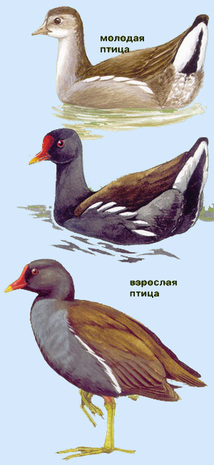 Размером с чирка, на воде напоминает мелкую утку, на берегу — курочку. Оперение чёрное, подхвостье белое, хорошо видное у сидящей на воде птицы. Голова с ярко-красным коротким клювом и продольным красным гребешком. Молодые светло-каштановые, без гребешка. Держится скрытно. Хорошо плавает, поднимая вертикально короткий хвост и кивая головой в такт гребным движениям лап; ловко бегает по мелководью и листьям растений, корягам и другим предметам Кормясь, переворачивает клювом листья растений, камешки и антропогенный мусор.