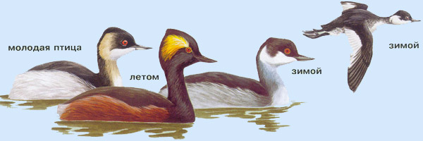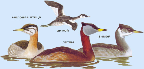 Несколько меньше большой поганки, от которой в брачном наряде отличается каштаново-рыжим цветом передней стороны шеи, светло-серыми щеками и менее развитыми перьевыми "рожками" на голове. В осеннем пере темно-серая шапочка спускается до глаз, белой брови нет, на шее спереди буроватый налёт. Клюв прямой, серый с жёлтым основанием. У молодых осенью сохраняются полосы на голове. В полёте на крыле видны два светлых участка, как у крас-ношейной поганки. Поведение типично для поганок — держится на воде, летает редко, хорошо ныряет. Голос громкий, грубый, разнообразный; его сравнивают с кваканьем, дребезжаньем, ржаньем, резким взвизгиванием.