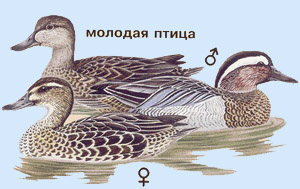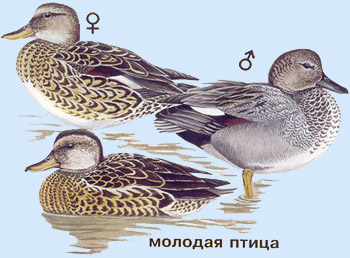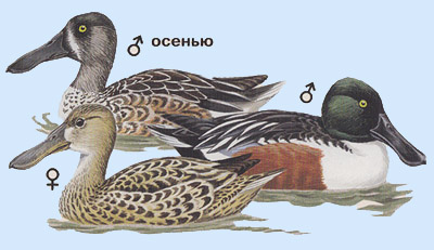 Заметно мельче кряквы; от других видов уток отличается очень длинным клювом, расширяющимся к концу в виде ложки. Самцы пегие с преобладанием на брюхе рыжего, на груби - белого и на голове - темно-зеленого, почти черного цвета. Самка и самец к концу лета - рыжевато-серые с пестринами. У взрослых во всех нарядах верхние кроющие перья крыла светлые, голубоватые, что хрошо видно в полете; зеркальце зеленое. Молодые похожи на самок. При кормежке нередко погружает голову или клюв в воду и процеживает ее, быстро, как волчок, вращаясь на одном месте. Голос самца - негромкое чмоканье, самки - звонкое кряканье. Населяет мелководные, густо заросшие водоемы с высокой биомассой мелких беспозвоночных: старицы, карьеры, заливы рек и озер с открытыми берегами, иловые площадки очистных сооружений.