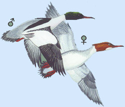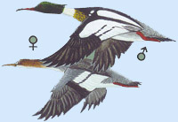 Примерно с крякву или немного мельче; клюв длинный, узкий, загнут на конце. Окраска пегая: у самца голова и спина чёрные, бока серые, зоб рыжий, "ошейник" и крылья сбоку белые. На голове и у самца, и у самки хохол. Самка серая с рыжей головой; граница рыжего и серого на шее, в отличие от самки большого крохаля, нечёткая, размытая. У самца и самки в полете на крыльях хорошо видны большие белые зеркальца. При плаванье глубоко погружается в воду, хорошо и подолгу ныряет. Полет быстрый, с частыми взмахами крыльев; с воды поднимается шумно, с разбега. Очень молчалив, голос -- хриплое карканье.