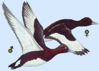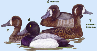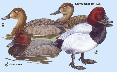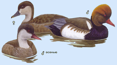 Несколько меньше кряквы. У самца в брачном оперении красновато-коричневая голова, голубоватый клюв, черная грудь и серая спина; радужина глаза красная. Самка и самец во второй половине лета имеют коричневый наряд с более светлой головой, особенно щеками, и более темной грудью. Крылья без белого зеркальца (во всех нарядах). Молодые похожи на взрослых самок. Глаза у самцов красные, у молодых птиц и самок - бурые.Посадка на воде глубокая, хвост не виден; часто ныряет. С воды взлетает тяжело, после разбега по воде; летит быстро и шумно. Голос самца в весеннее время - носовой свист, самка хрипло каркает. Держится на относительно глубоких водоемах, чистых плесах с заросшими берегами; нередко поселяется вблизи колоний чайковых птиц.