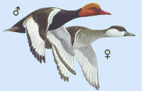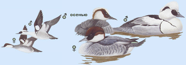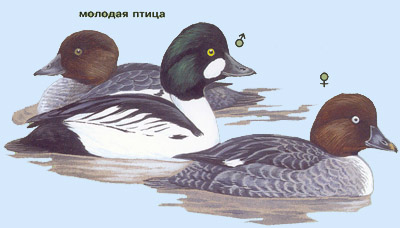 Вдвое меньше кряквы, чуть больше чирка. Окраска самца преимущественно белая, с черной спиной; на голове выделяется черная маска. Самка тёмно-серая с рыжей головой и белыми щеками. Во всех нарядах на крыле белое зеркальце, более крупное у самца. Молодые похожи на самок. На воде сидит глубоко - видна голова, плечи и передняя часть спины. Шея обычно втянута в плечи. Хорошо ныряет. Летает быстро. Сравнительно малоосторожен. Молчалив, голос — короткое трескучее "крр. ".