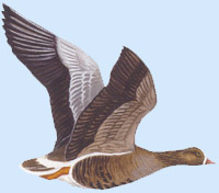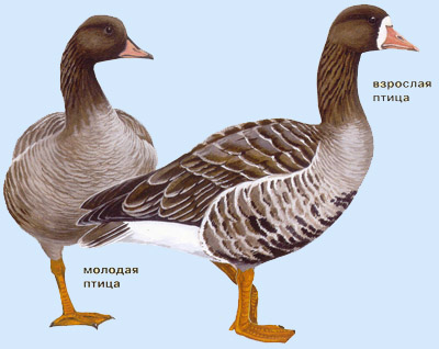 Заметно мельче серого гуся и гуменика. Отличается от них белым пятном на лбу, не заходящим на темя; в полете на брюхе хорошо заметны неровные темные поперечные полосы (у молодых птиц отсутствуют). Общая окраска светлее, чем у гуменника, клюв розовый, лапы рыжеватые. Посадка на воде, полет, форма стай, поведение и места кормежки в период пролета — как у серого гуся. Менее осторожен, чем серый гусь и гуменник. Голос выше, чем у этих двух видов гусей — звонкое, довольно мелодичное гоготание. Северный вид, гнездящийся в тундре.