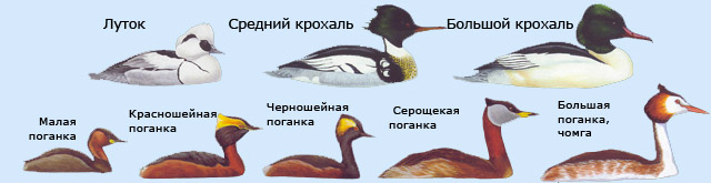 Погадки зимородка можно найти в его норах, а также под теми предметами, сидя на которых он стережет рыбу. Цапли и крачки оставляют погадки, состоящие также из костей рыб. Их можно найти на отмелях, где отдыхают эти птицы. (Эти погадки непрочны и легко размываются дождем, рассыпаются от ветра). Чайки всеядны, в их погадках можно найти — то остатки майских жуков и лягушек (сизые чайки Архангельской губ., например), то насекомых, пойманных на пашне (речные чайки Нижегородской губ.), то частицы панцирей крабов, как в погадке чайки-хохотуньи.