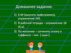 § 44 (выучить орфограмму), упражнение 245. В рабочей тетради – упражнение 18 (б,в). По желанию – сочинить сказку о суффиксе – чик- (-щик-).