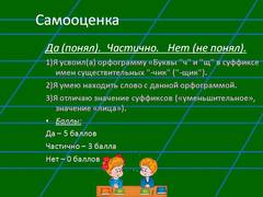Да (понял). Частично. Нет (не понял). 1)Я усвоил(а) орфограмму «Буквы "ч" и "щ" в суффиксе имен существительных "-чик" ("-щик"). 2)Я умею находить слово с данной орфограммой. 3)Я отличаю значение суффиксов («уменьшительное», значение «лица»). Баллы: Да – 5 баллов Частично – 3 балла Нет – 0 баллов