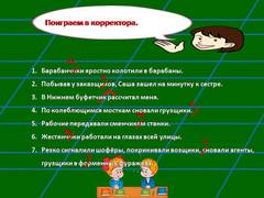 Слайд 7 Барабанчики яростно колотили в барабаны. Побывав у заказщиков, Саша зашел на минутку к сестре. В Нижнем буфетчик рассчитал меня. По колеблющимся мосткам сновали грузщики. Рабочие передавали сменчикам станки. Жестянчики работали на глазах всей улицы. Резко сигналили шофёры, покрикивали возщики, сновали агенты, грузщики в форменных фуражках. Поиграем в корректора. ч ч ч ч щ щ щ