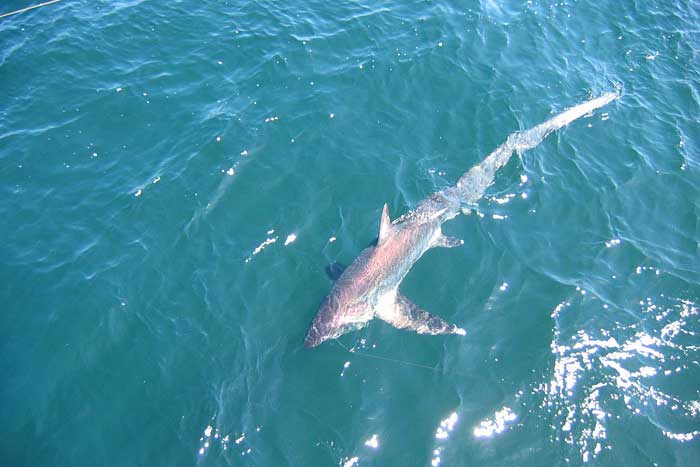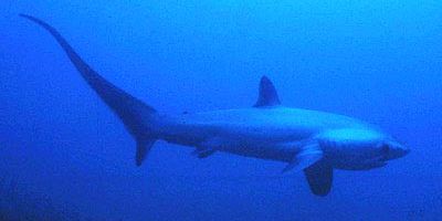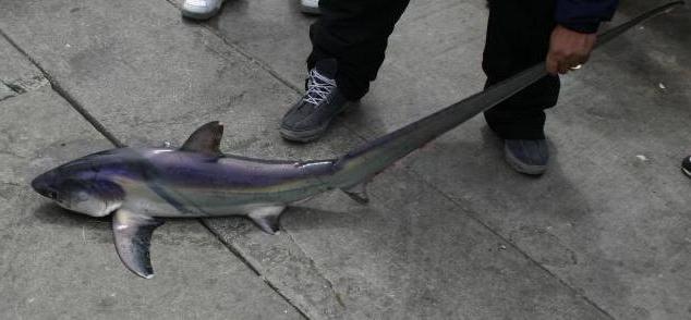 Лисья акула имеет очень длинную верхнюю долю хвостового плавника, достигающую длины всего туловища.