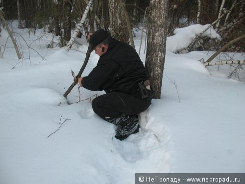 При определении направления следа на рыхлом снегу нужно, помнить, что потаском при опускании лапы зверь сваливает снег под острым углом, а вытаскивает лапу почти вертикально. Помимо того, кромка передней стенки следа вследствие нажима на него голенью ноги при вытаскивании ее зверем из снега всегда бывает плотнее, что легко определить на ощупь.