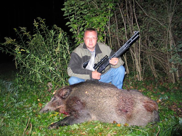 При добыче кабана используют как гладкоствольное, так и нарезное охотничье оружие. Из гладкоствольного применяют двуствольные ружья и полуавтоматы 12 и 16 калибра, и стрельба производится патронами, снаряженными различными видами пуль: Якана, Бреннеке, «Вятка», Майера, «Идеал», ВВОО-Ильина, Полева, Блондо и д.р. Охотник должен подобрать путем пристрелки своего ружья ту пулю, которая будет его удовлетворять, т.е. качество боя пулей определяется точностью, кучностью и пробивной способностью пули. Многие охотники зачастую перед ответственными охотами снаряжают патроны сами, и я считаю, что это делают они абсолютно правильно, что неоднократно было доказано на практике.
