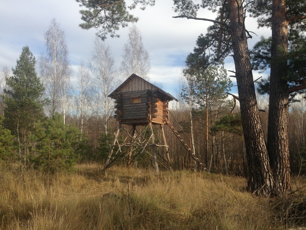 Вышки и лабазы устанавливаются близ прикормочных площадок. Чаще всего егерь с вечера подсыпает корм, и на вышку вы можете встать уже за час до захода солнца.
