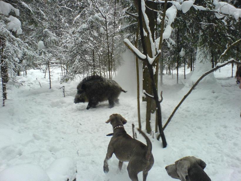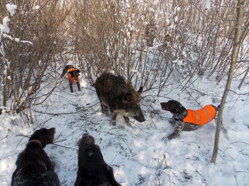 Подвижные лайки больше всего подходят в качестве компаньонов в этом деле. Мой знакомый ездил на кабана с гончими, но ничего хорошего из этого не вышло. Да, это крупные собаки, но их длинное тело не так изворотливо, поэтому после встречи с клыками кабана они постоянно калечатся.
