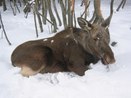Раненый лось, не чующий погони, достаточно быстро ляжет на снег остудить рану.