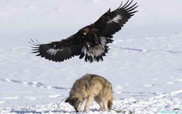 Беркут впивается в спину волка острыми когтями и когда охотник подходит к месту схватки, то волк уже повержен и ему остается только добить его ножом.