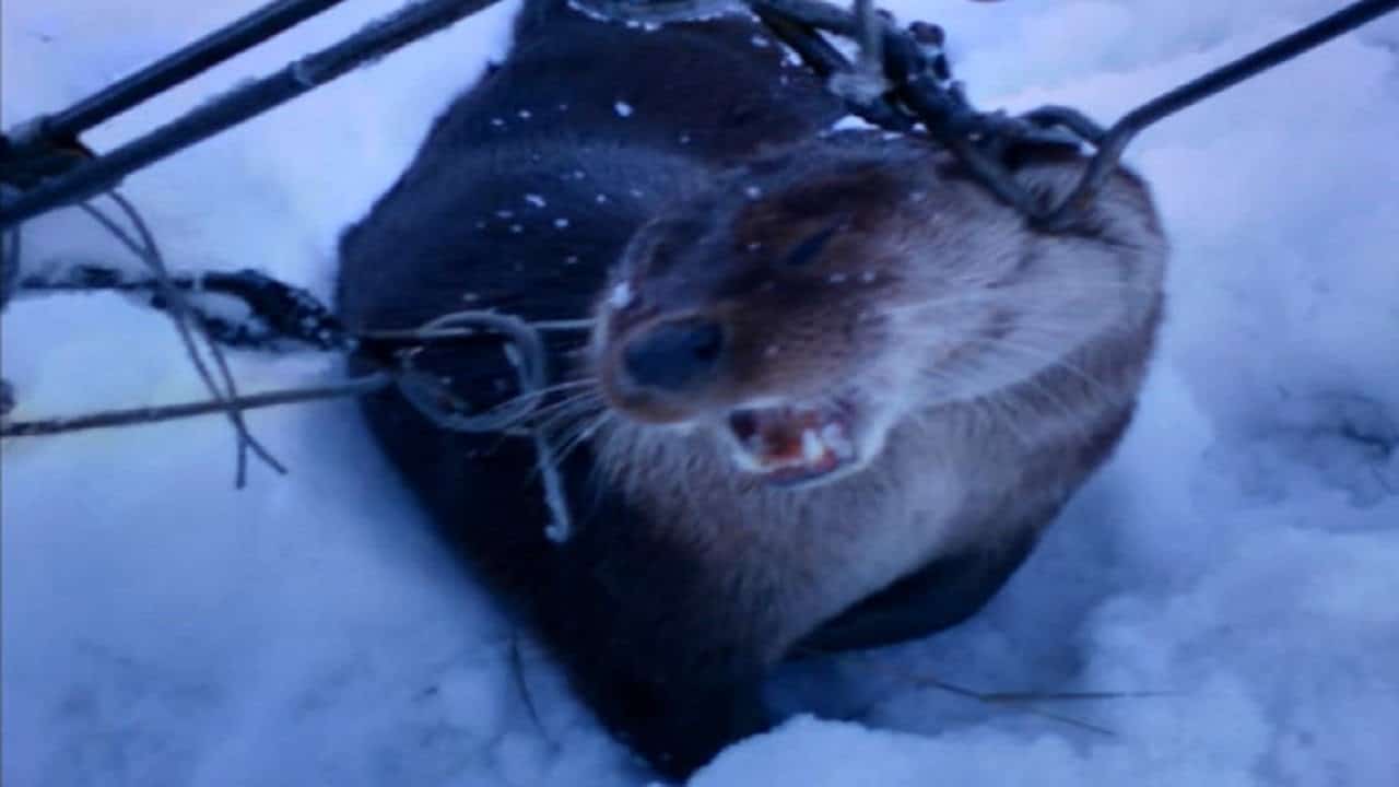 Зимой выдра выбирается на берег в местах, где вода не замёрзла. Сначала отследите такие участки и там ставьте капкан под водой не глубже тридцати сантиметров. На капкан следует прикрепить приманку из рыбы, которая должна быть направлена головой по течению, чтобы имитировать движение.
