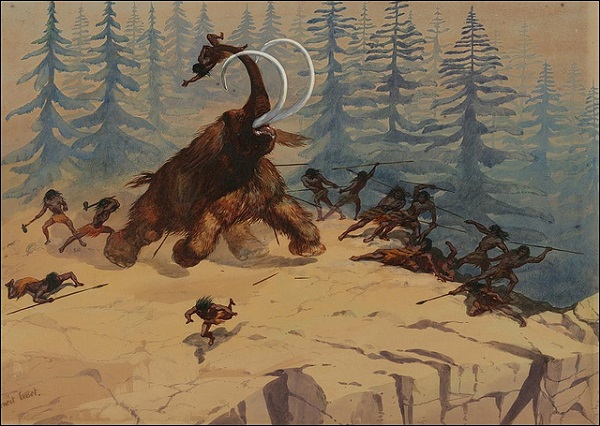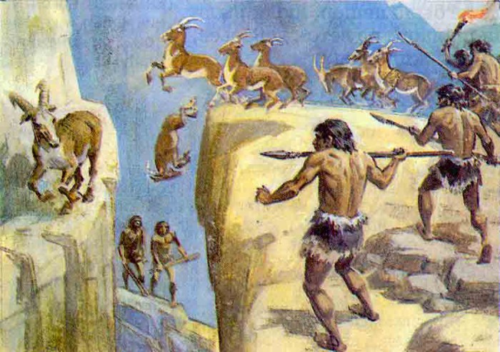 Гораздо тяжелей давалась первобытным людям охота на крупных животных: бизонов, слонов и мамонтов. Чаще всего для этой цели использовался загонный способ, в котором участвовала вся мужская часть племени. Выследив стадо крупных млекопитающих, первобытные люди начинали гнать его шумом, криками и пугать огнем, постепенно загоняя в заранее подготовленную ловушку. Как правило, это была очень глубокая яма, крутой обрыв или узкое ущелье. Одно или несколько животных, попадая в ловушку, разбивались, а еще живых особей племя добивало копьями, камнями и дубинами. Постепенно добычу разделывали и переносили поближе к жилищам.