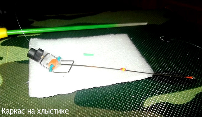 К месту крепления каркаса и на кончик хлыстика водостойким клеем на основе цианоакрилата приклеиваем отрезки мелкого кембрика для пропуска лески.