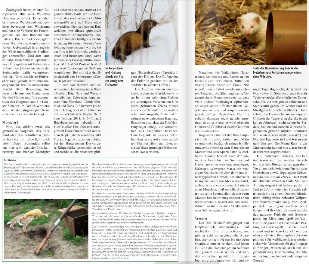 Но это все касается в первую очередь Италии и Испании, где вся прелесть такой охоты состоит в том, что кроли тысячами живут в мелиоративных трубах на склонах гор и виноградников. В Швейцарии все по-другому. В Швейцарском Егере №7 2011 года на страницах 14-18 как раз есть интересная статья об охоте с хорьками в Швейцарии.