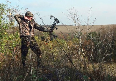 Обходя терновники по периметру, лук нужно всегда держать наизготовку, упираясь указательным пальцем в тетиву, чтобы зафиксировать хват релиза и чувствовать где тетива в готовности растянуть лук. Чтобы снять напряжение с левой руки, постоянно удерживающей лук на весу (вот почему легкие луки предпочтительнее для такой охоты), - нижний блок лука можно упирать в верхнюю часть бедра левой ноги, что дополнительно обеспечит сохранность нижнего блока в кустарнике с амортизацией его флисовым костюмом. Фото Ольга Фрунзэ. Увеличивается по нажатию.