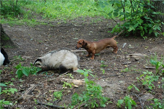 Тактика барсучьей охоты с применением таксы такова, мы запускаем собаку в конце норы, а сами ждём с входа, когда выбежит животное. При этом у входа и выхода норы должны стоять охотники. Бывают случаи, когда такса стравливает зверя, и он бежит не от собаки, а, наоборот, к ней. Такса выбегает, а за ней и барсук. Мы должны стоять у выхода из норы с уже взведёнными курками и когда покажется голова полосатого красавца тут-то мы и должны сделать выстрел.