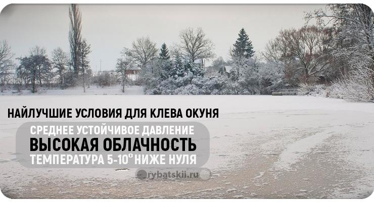 Рыбалка будет результативной, если стоит ясная, тихая погода. Обитатели водоемов охотно реагируют на приманку в морозные дни. В оттепель окунь клюет в течение всего дня, а после завершения снегопада рыба малоактивна. Аналогично она себя ведет в то время, когда идет снег.